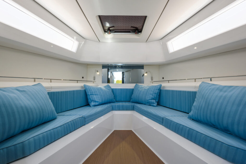 Below deck there’s a whole new range of custom options and convertible spaces. Everything aboard the R4 XT yacht holds a new customization possibility, exclusively tailored to your needs. The dining and relax areas at the bow are equipped with sofas and a large dinette that can be easily converted into a double berth or a pleasant open space.