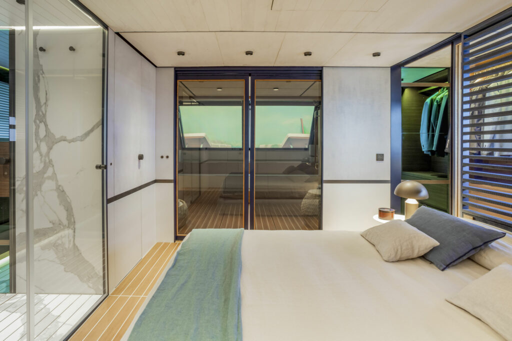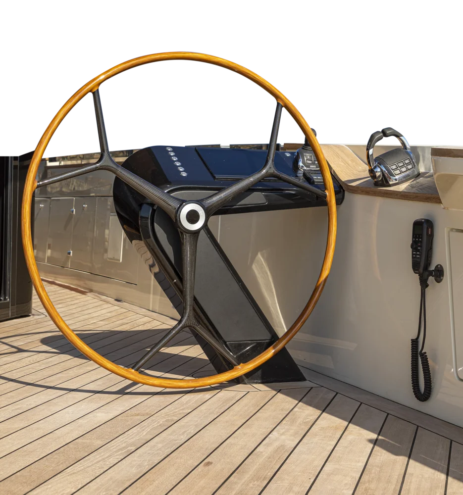 The designer’s challenging concept shows through the endless opportunities aboard, with convertible space and four helm stations, including two ship’s wheels that allow for steering closer to the sea and for easier maneuvers.